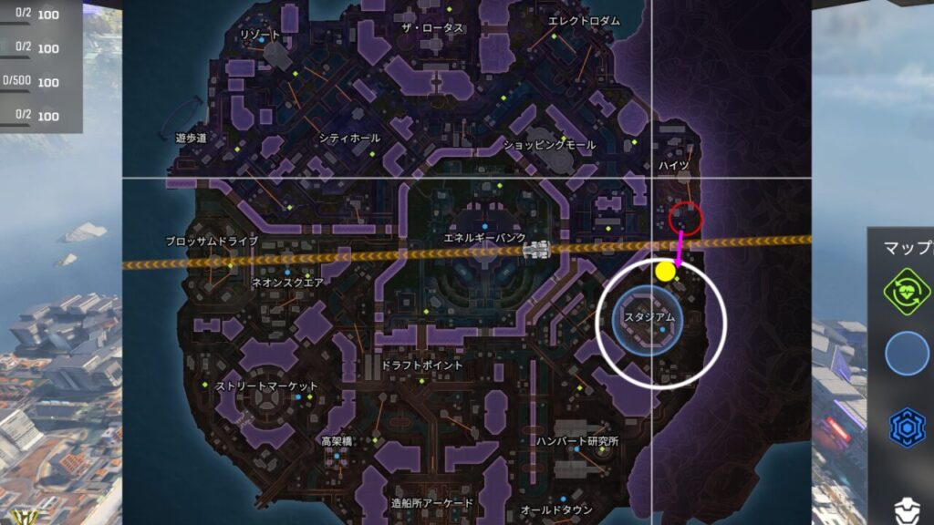 白丸が安置、赤丸で敵同士が戦っているときに戦闘終了後敵が安置に入ってくる道は紫矢印しかありません。